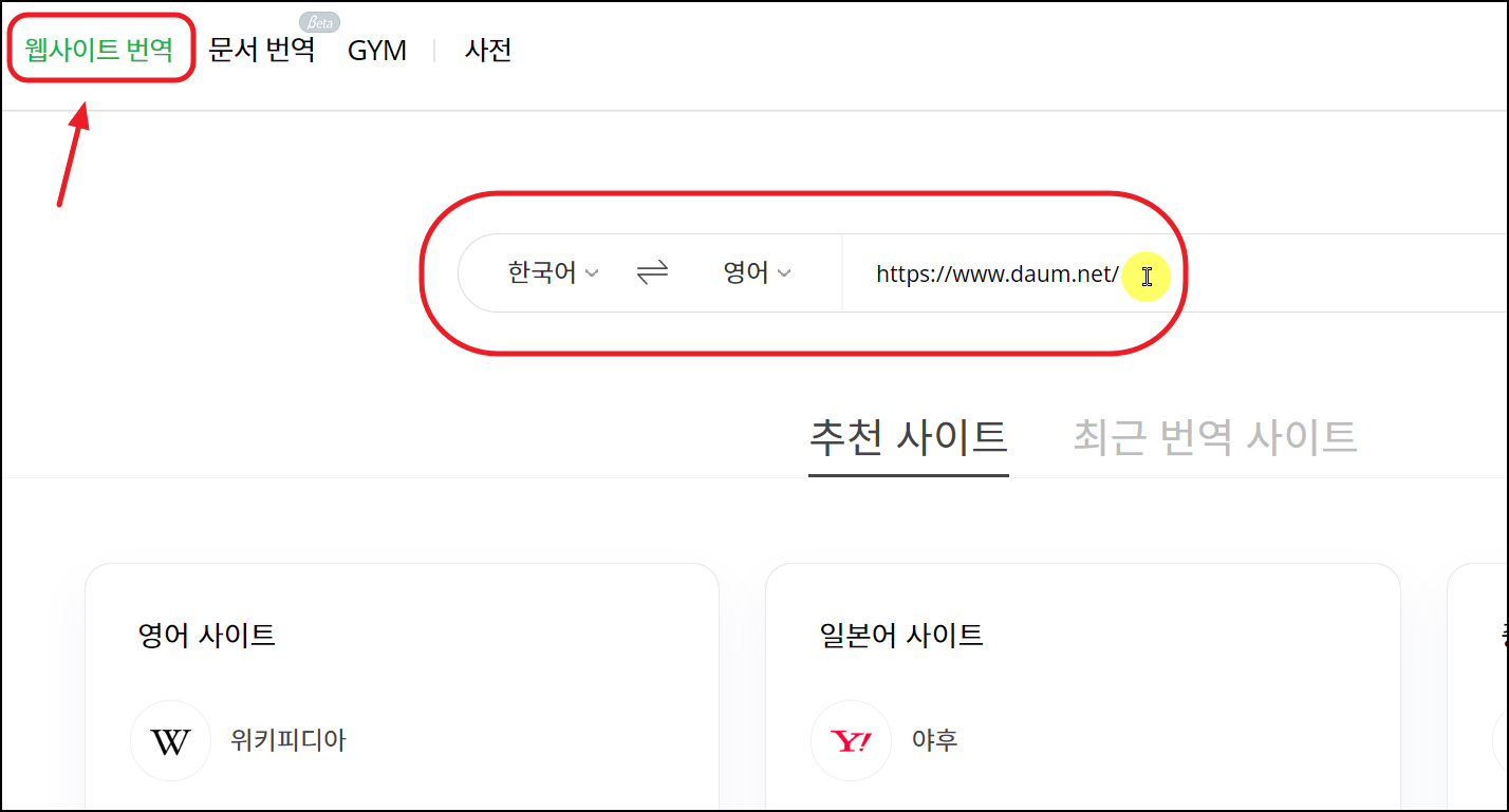 메뉴에서 [웹사이트 번역]을 선택해 보세요. 그럼 인터넷을 할 때에도 네이버 영작기의 도움을 받을 수 있어요. 자신의 웹서비스를 영어로 변경할 때 사용하면 좋을 것 같아요. 그럼 화면 중앙에 위치한 인터넷 주소 입력창에 영어로 바꾸고 싶은 사이트 주소를 입력해 보세요. 참고로 입력창 옆에 있는 "한국어"와 "영어"를 제대로 설정해 주어야 합니다.
