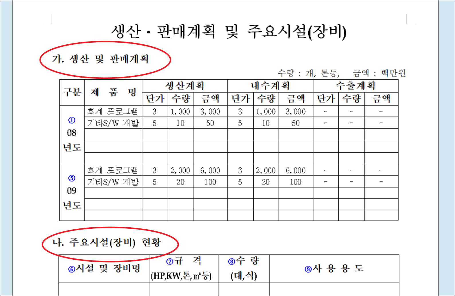 생산, 판매계획 및 주요시설 부분을 입력하는 부분도 있는데요. 프로그래밍을 할 때 사용하는 유료 소프트웨어나 보안을 위한 보안 소프트웨어에 대한 비용 지급이 있다면 이에 대한 것을 주요시설 현황에 입력해 주세요.