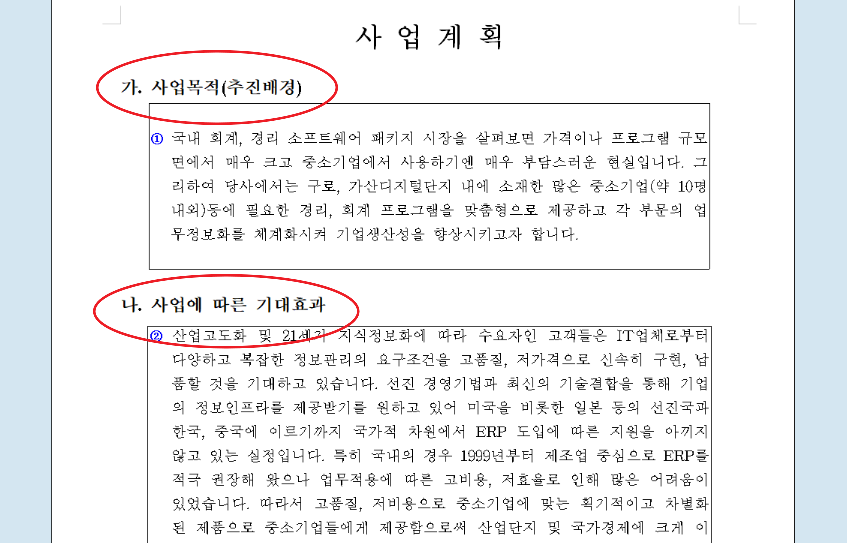 생산 물품이나 공장이 없는 관계로 제공하는 서비스에 대해 상세히 기술할 필요가 있는데요. 사업목적, 사업에 따른 기대효과 등을 상세하고, 명확하게 작성한다면 투자자로 부터 좋은 인상을 받을 수 있을 겁니다. 양식 파일에 이러한 부분이 포함되어 있으니 참고하시길 바랍니다.