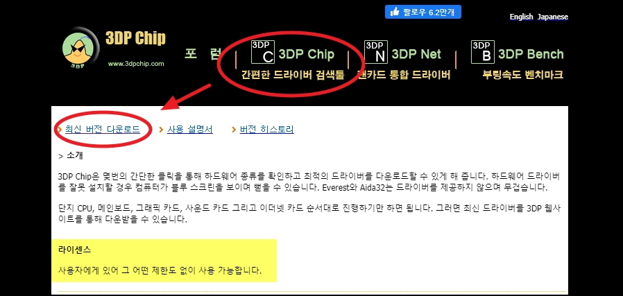 3dp chip 공식 홈페이지에 접속하면 드라이버 검색툴인 3dp chip 최신 버전을 다운로드 한 후 실행해 주세요. 프로그램 설치 없이 바로 사용할 수 있습니다. 안내 문구에 나타나 있듯이 어떠한 제한 없이 무료로 사용할 수 있습니다.