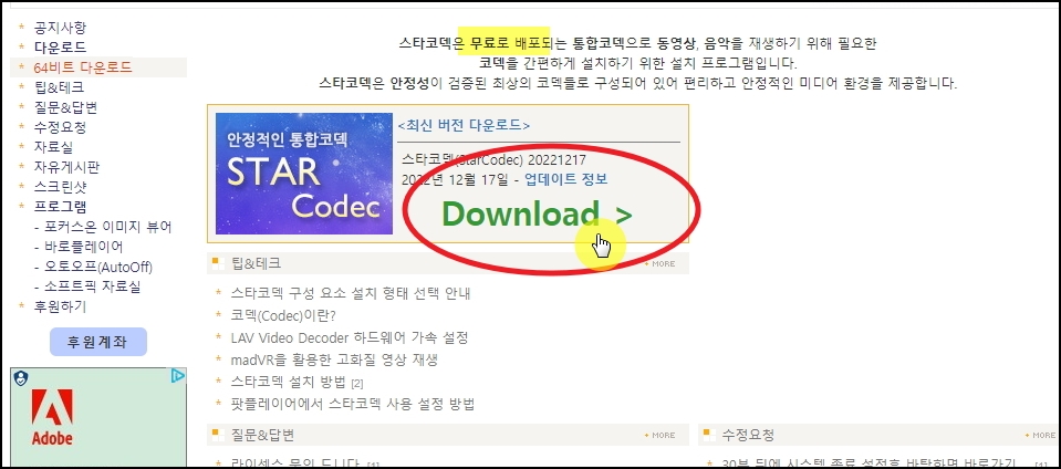 스타코덱 공식 홈페이지에 접속하면 안정적인 최신 버전을 다운로드 받을 수 있는데요. 안내에 따라 설치를 진행하면 됩니다.