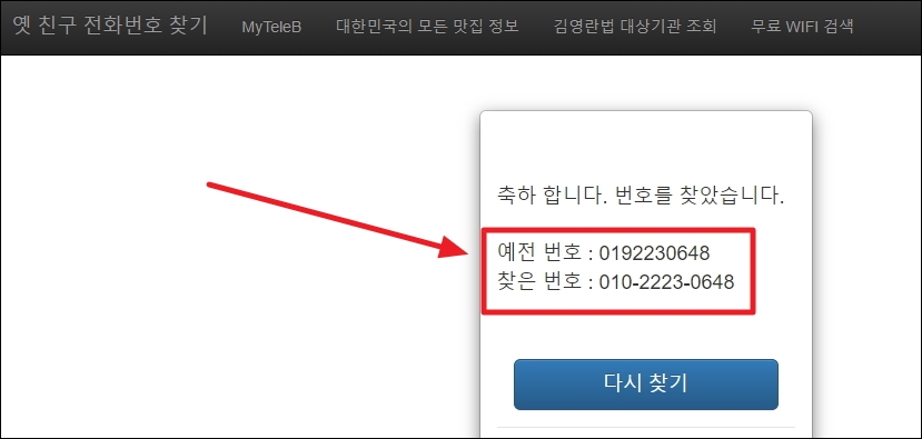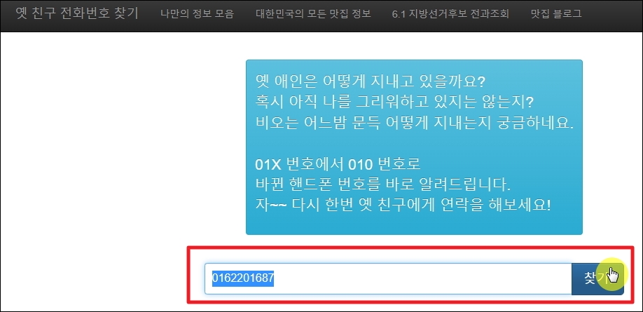 옛 친구 전화번호 찾기 서비스를 사용하는 방법은 간단한데요. 화면 중앙에 있는 검색창에 011, 016, 017, 018, 019로 시작하는 옛날 전화번호를 입력해 주세요. 그 다음 "찾기" 표시가 되어 있는 버튼을 누릅니다. 옛날 애인이나 친구가 어떻게 지내는지 궁금할 때 또는 연락하고 싶을 때 유용하다고 하네요.