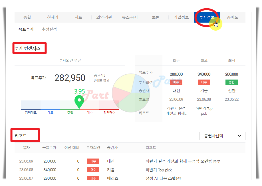 8. 투자정보 메뉴를 선택하면 주가 컨센서스, 여러 증권사의 리포트와 같은 정보를 확인할 수 있는데요. 다음증권 사이트에서는 이러한 정보를 보기 편하게 잘 정리되어 있어요.