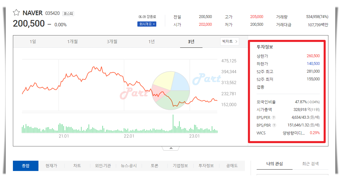 5. 개별 종목에 대하여 자세한 정보를 확인하고 싶은 경우에는 [주가정보 자세히] 버튼을 클릭해 보세요. 저는 최근까지 주식시세가 많이 하락한 NAVER 증권에 관심이 많은데요. 전고점 대비 절반 수준으로 하락했으니 이제는 다시 상승할 시기가 찾아온 것 같아요. 개별 종목 페이지를 보면 실시간으로 제공되는 시세 차드는 기본이고, 투자에 도움이 되는 다양한 정보를 제공하고 있는데요.