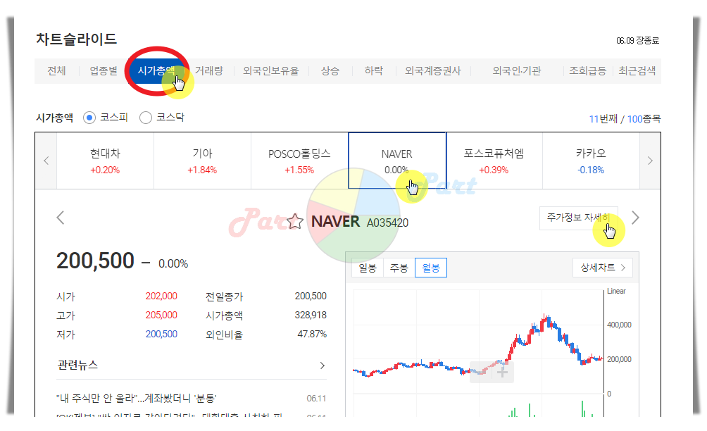 4. 차트슬라이드 전용 메뉴를 보면 시가총액, 거래량, 외국인보유율, 상승, 하락 등을 기준으로 설정할 수 있도록 되어 있는데요. 저는 여기에서 "시가총액"을 선택한 후 코스피와 코스닥에서 시가총액이 높은 종목 상위 100개를 전체적으로 살펴봅니다. 대부분의 HTS에도 이와 비슷한 기능이 제공되고는 있지만, 다음증권과 같이 보기 편하게 되어 있지 않지는 않아요. 많은 금융 정보를 제공하는 것도 좋지만, 이렇게 사용자의 활용도를 높일 수 있는 시스템이 이용자 입장에서 더욱 이롭다고 생각합니다.