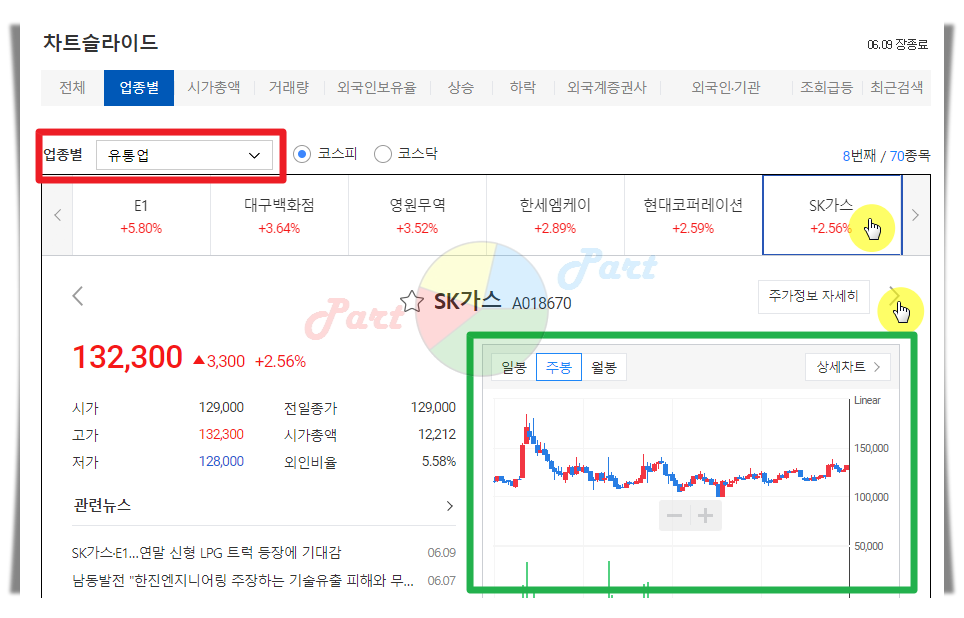 3. 차트슬라이드는 다음증권에서만 볼 수 있는 굉장히 유용한 서비스입니다. 저는 특정 업종에 속한 모든 주식 종목에 대하여 짧은 시간에 살펴보고 싶을 때 자주 이용하는데요. 우측 하단에 있는 차트를 주봉이나 월봉으로 해놓고, 하나씩 종목을 바꾸어가며 돌려보면 전체적인 흐름을 파악하는 데에 용이합니다.