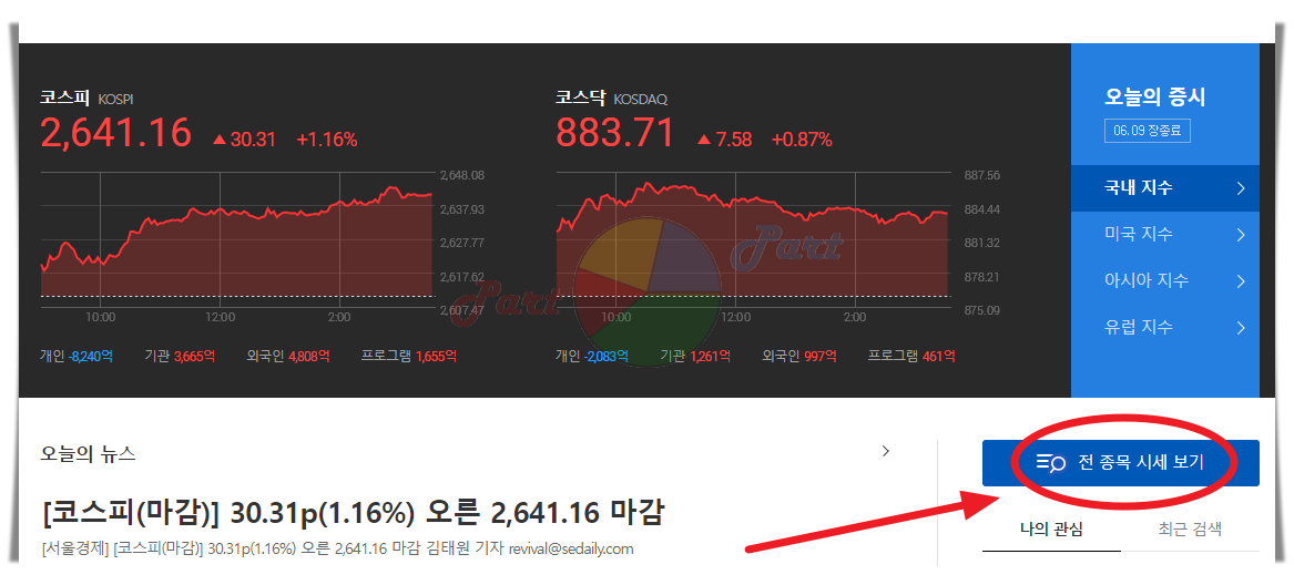 1. 위 화면은 다음증권 홈페이지에 접속했을 때 맨 처음 만나는 메인화면입니다. 주식 투자를 하거나 경제에 관심이 있는 분이라면 오늘의 국내 지수는 물론이고, 여러 나라의 지수를 하루에 한 번 정도는 확인하게 되는데요. 그래프를 통해 개인, 기관, 외국인 매매 현황과 함께 코스피와 코스닥 지수의 흐름을 확인할 수 있습니다. 저는 여기서 지수 현황을 잠깐 살펴본 후 우측에 있는 [전 종목 시세 보기] 메뉴를 클릭합니다.