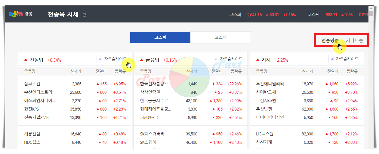 2. 다음증권의 전종목 시세 서비스는 과거 증권거래소에서 볼 수 있던 전광판과 비슷한 역할을 하는데요. 같은 업종끼리 묶어서 모든 코스피 및 코스닥 주식 종목에 대한 시세를 한눈에 볼 수 있게 해놓았습니다. 전체적으로 한 번 훑어보고 싶은 분들은 "가나다순"으로 정렬을 하면 보기에 편합니다. 위 화면에 보면 여러 업종의 시세를 확인할 수 있게 되어 있는데요. 여기에서 [차트 슬라이드] 버튼을 클릭해 보세요.