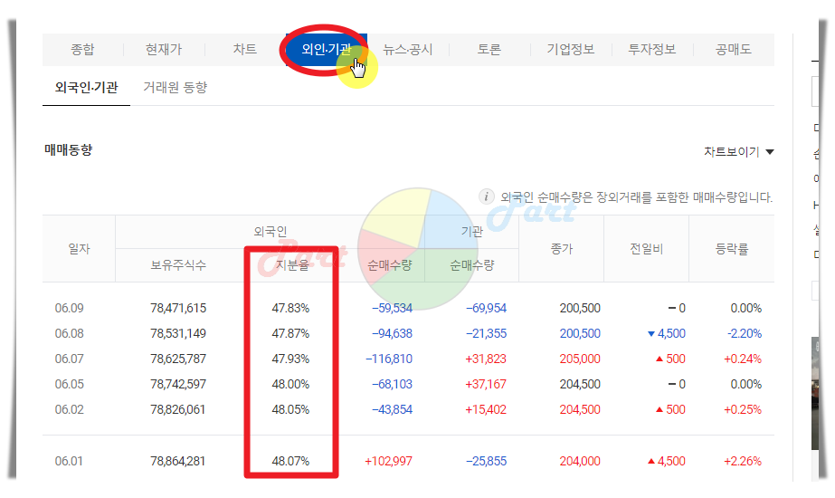 6. 다음증권 사이트 화면에서 중앙 부분을 살펴보면 여러 가지 메뉴가 있는데요. 다방면으로 해당 종목에 대한 정보를 살펴보고 싶을 때 유용합니다. 외인 및 기관 메뉴를 선택해 보세요. 국내 주식시장의 큰손이라고 할 수 있는 외국인과 기관의 매매 현황을 살펴볼 수 있습니다. NAVER 증에 대한 외국인 지분율은 현재 47.83% 이네요.