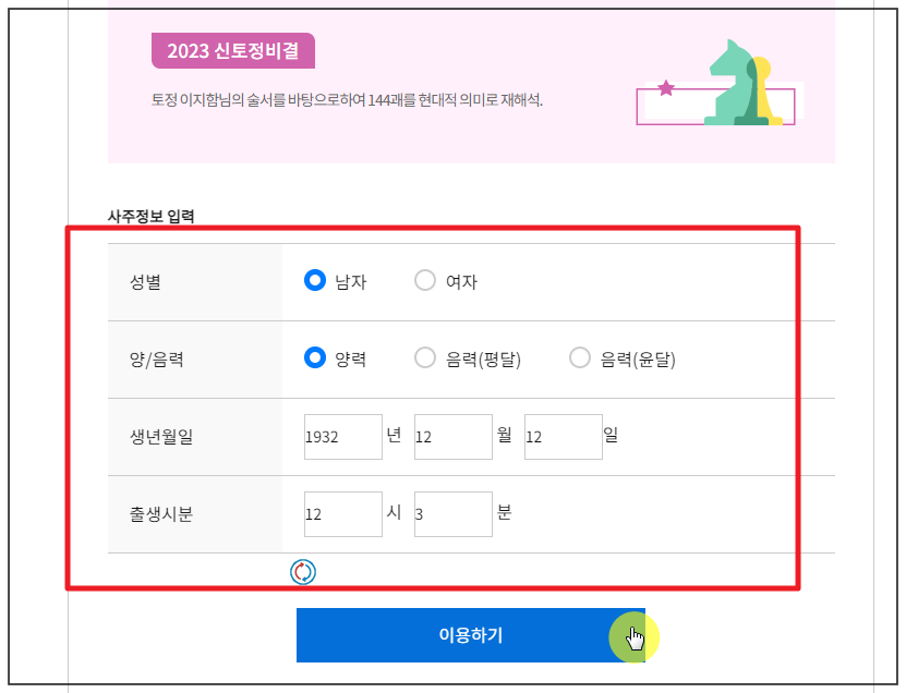 4. 개인적으로 토정비결을 보는 것을 좋아하는데요. 과거부터 적중률이 매우 높기로 유명한 것이기 때문이에요. 간단한 사주정보만 입력하면 자세하게 2023년 나의 운에 대해 다방면으로 알아볼 수 있죠. 그럼 성별, 생년월일 등의 정보를 입력한 후 "이용하기" 버튼을 눌러주세요.