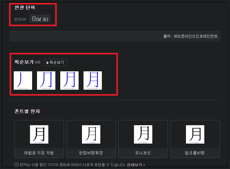 6. 연관 단어로는 "날 일"이 있군요. 획순보기를 통해 어떻게 해당 한문을 쓰는지 순서를 알 수 있어요. 다음에 그려서 한자를 찾을 때 참고하면 좋습니다.
