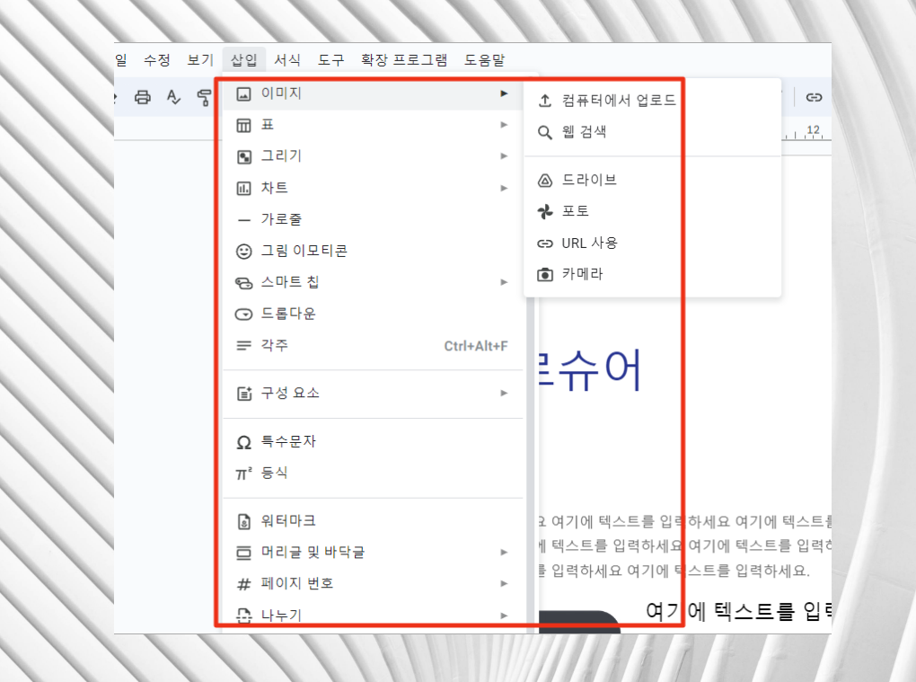 11. 문서 작성을 할 때에는 이미지, 표, 그림, 차트, 이모티콘 등 여러 가지 요소들을 넣게 되는데요. 삽입 메뉴를 클릭하면 그러한 요소들을 사용할 수 있습니다.