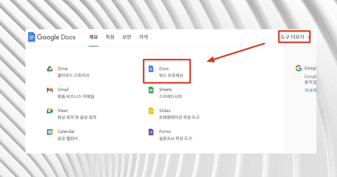 3. 사이트 화면에서 우측 상단에 있는 도구 더보기 버튼을 클릭해 보세요. 그럼 워드프로세싱, 스프레드시트, 프레젠테이션 작성 도구, 설문 조사 작성 도구와 같이 다양한 문서를 작성하는데 도움이 되는 프로그램을 선택할 수 있습니다. 기본적으로 글을 작성할 때에는 워드 프로세싱인 Docs를 선택하면 됩니다.