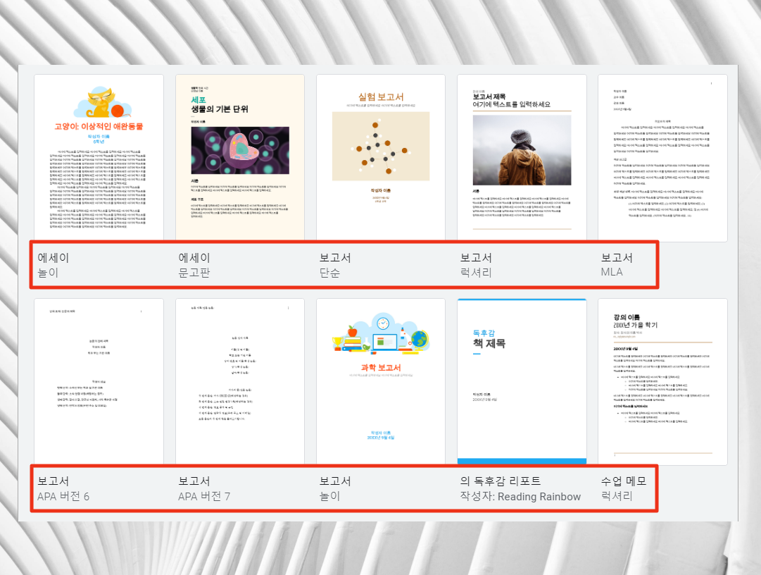 1. 문서 작성을 할 때 어떻게 시작해야 할지 고민을 될 때가 있습니다. 이런 경우 템플릿을 활용하면 좋은데요. 에세이, 보고서, 브로슈어, 수업 메모, 독후감, 리포트 등 다양한 템플릿을 활용할 수 있습니다. 그럼 프로그램 사용 방법에 대해 알려 드릴게요.
