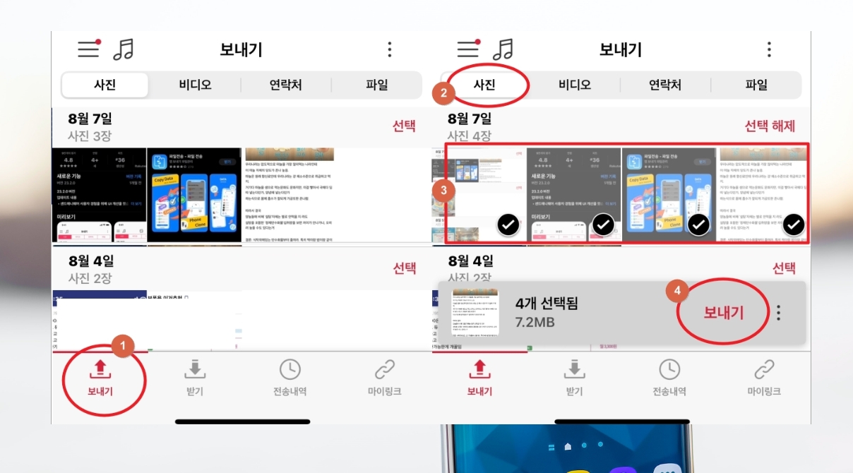 2. 앱 설치가 완료되면 실행해 보세요. 이 앱을 이용하여 핸드폰 사진은 물론이고, 비디오, 연락처, 파일을 옮기는 것이 가능합니다. 사용 방법도 매우 간단한데요. 앱 화면이 나타나면 상단에 있는 메뉴에서 "사진"을 선택한 후 컴퓨터로 옮기고 싶은 사진을 선택합니다. 그럼 앱 화면 하단에 "보내기" 버튼이 나타나는데요. 해당 버튼을 클릭해 주세요.