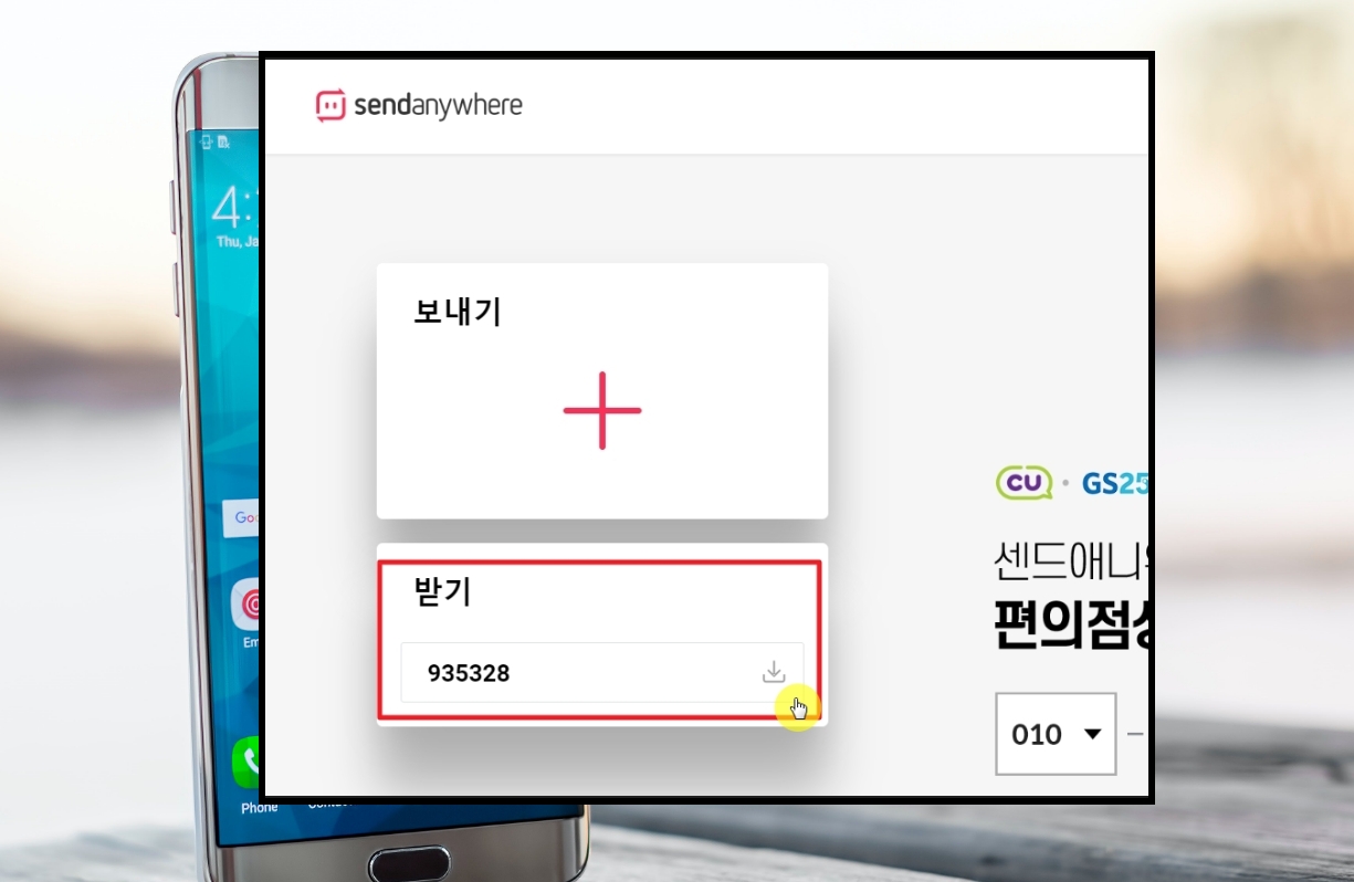 5. 센드애니웨어 사이트에 접속했습니다. 해당 사이트를 통해 여러 가지 파일을 보내거나 받는 것이 가능한데요. 좌측에 있는 "받기" 영역에서 좀 전에 핸드폰 화면에 나타난 6자리 숫자 코드를 입력해 주세요. 그 다음 바로 우측에 있는 다운로드 아이콘을 클릭합니다.