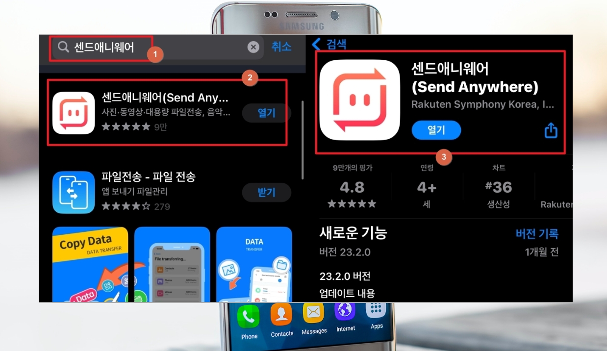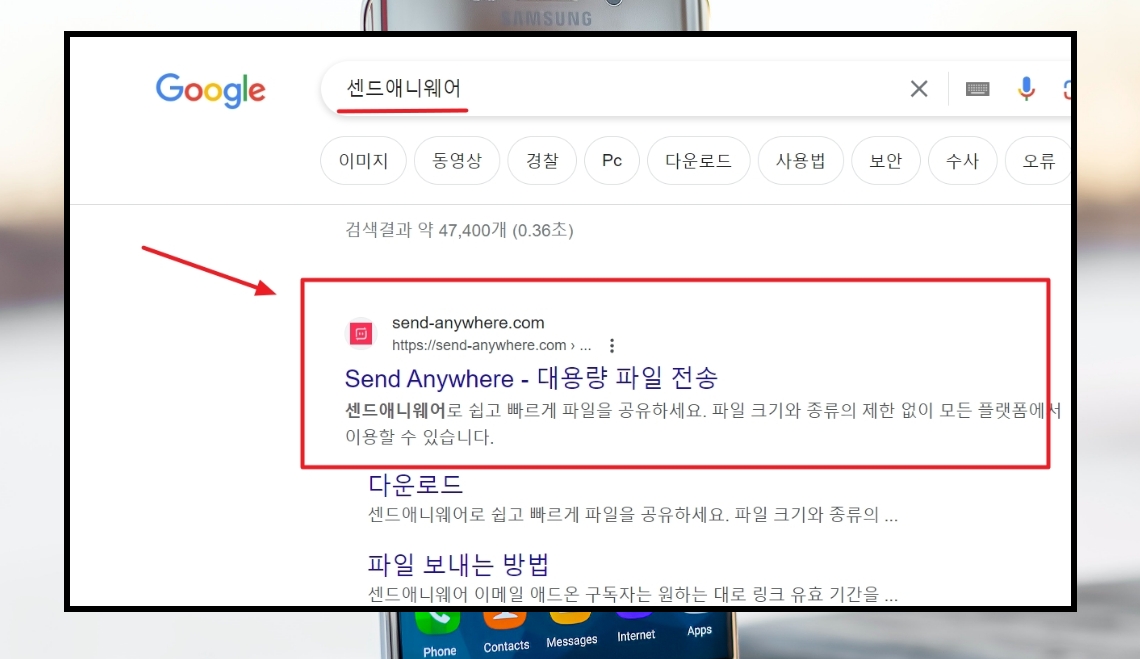 1. 제가 알려드릴 방법을 사용하려면 무료 앱을 하나 설치해야 합니다. 이 앱을 통해 아무런 조건 없이 사진이나 동영상 등의 파일을 옮기는 것이 가능한데요. 바로 "센드애니웨어" 앱 입니다. 구글 플레이 스토어나 아이폰의 앱스토어를 통해 손쉽게 설치할 수 있는 프로그램입니다. 가볍고, 빠른 앱이기 때문에 부담 없이 사용이 가능합니다.
