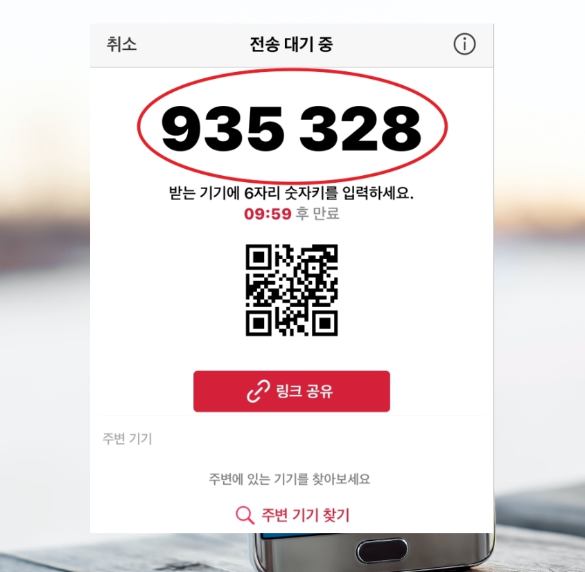 3. 보내기 버튼을 누르면 "전송 대기 중" 창이 열립니다. 6자리 숫자키를 얻을 수 있죠. 이 숫자를 잘 기억해 두세요. 컴퓨터로 핸드폰 사진을 전송 받을 때 사용해야 할 숫자입니다.