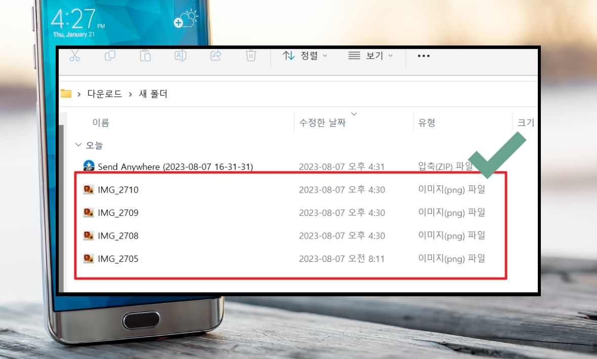 8. 압축 파일을 풀어보니 제가 핸드폰에서 전송한 사진이 나타났네요. 용량 손실 없이 100% 그대로 전송 완료 되었습니다.