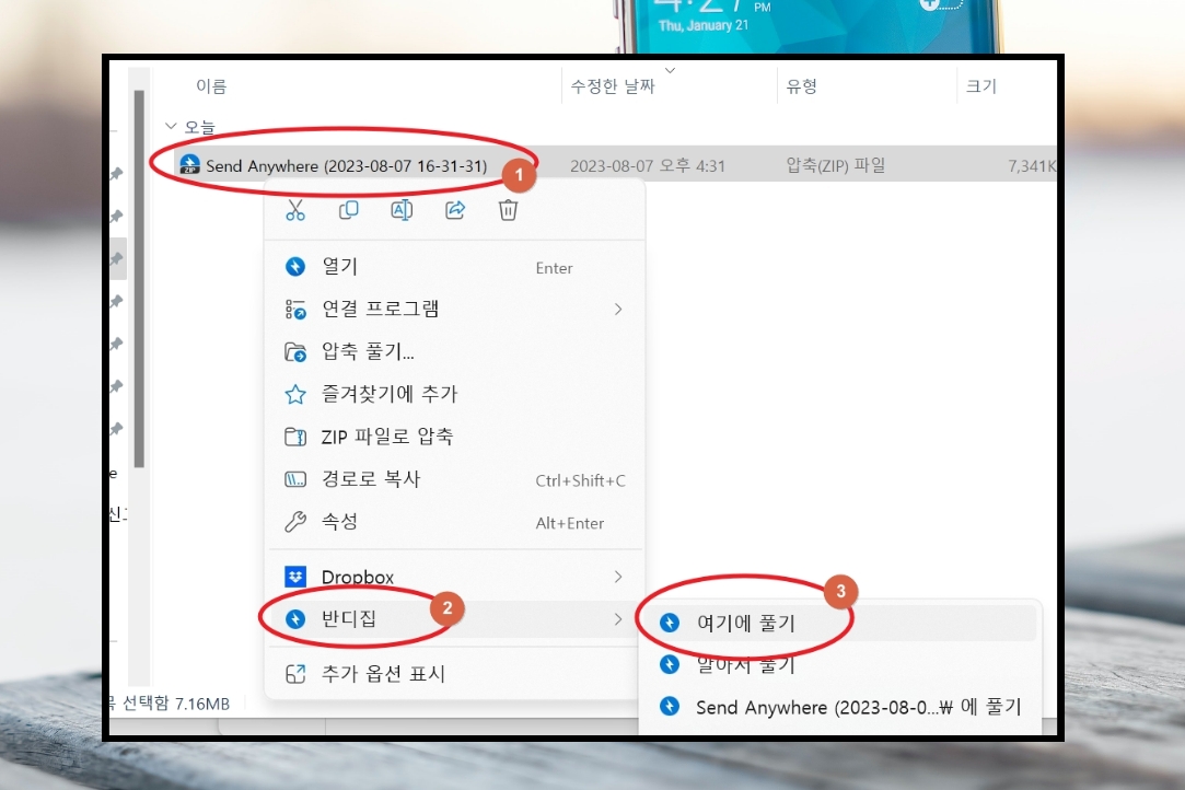 7. 전송이 완료되면 컴퓨터 하드디스크에 핸드폰 사진 파일이 저장이 되는데요. 파일의 갯수가 여러 개인 경우에는 압축된 모습으로 전송이 됩니다. 이런 경우에는 알집이나 반디집과 같은 압축 관련 프로그램을 이용하여 압축을 해제하면 됩니다.