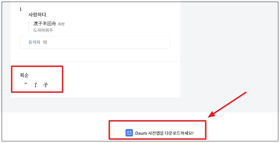 지금까지 컴퓨터로 한문찾기 하는 방법을 설명해 드렸는데요. 해당 서비스는 스마트폰을 통해서도 동일하게 이용이 가능합니다. Daum 사전앱을 설치하면 스마트폰 앱을 통해 한문을 찾아볼 수 있어요.