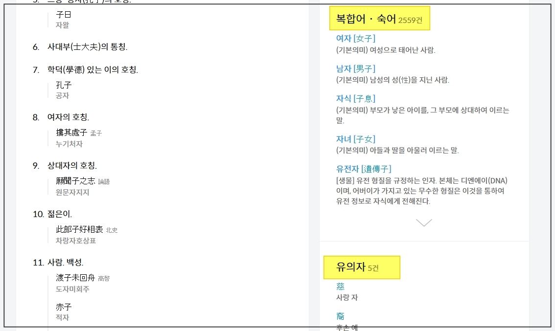 4. 저는 "아들 자"라는 한자를 검색해 보았는데요. 해당 한자를 포함하고 있는 단어까지 찾기 가능합니다. 하나의 한자에 대해 옥편처럼 자세하게 알아보고 싶을 때에는 맨 위에 위치한 "음/한자" 부분을 선택하면 돼요.