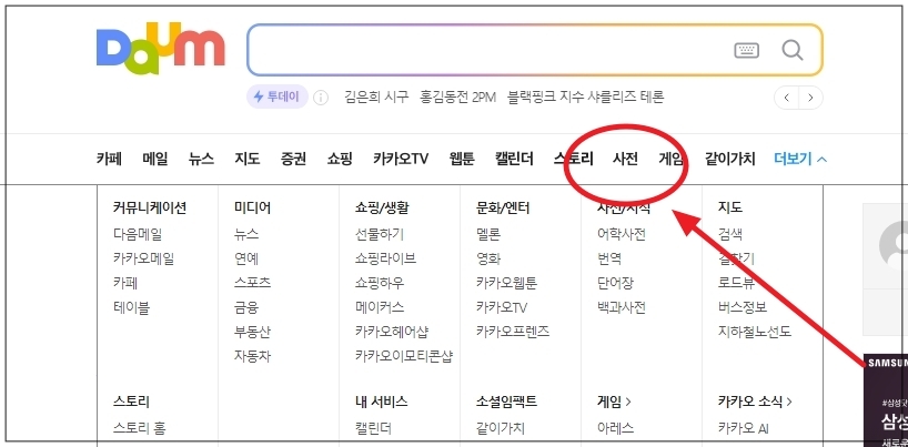 1. 국내에서 많이 사용되는 포털 사이트 중 하나인 다음을 이용하면 빠르게 한문찾기를 할 수 있는데요. 다음 사이트의 메인화면에 보면 메뉴에 "사전 서비스"가 있습니다. 해당 메뉴를 선택해 보세요.