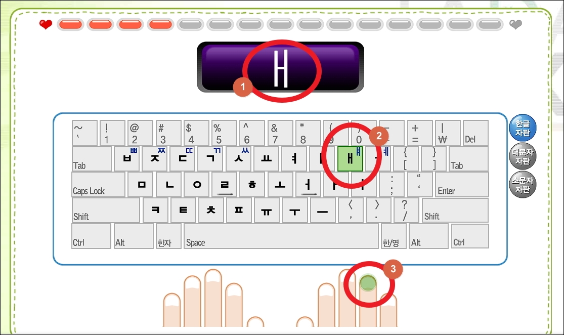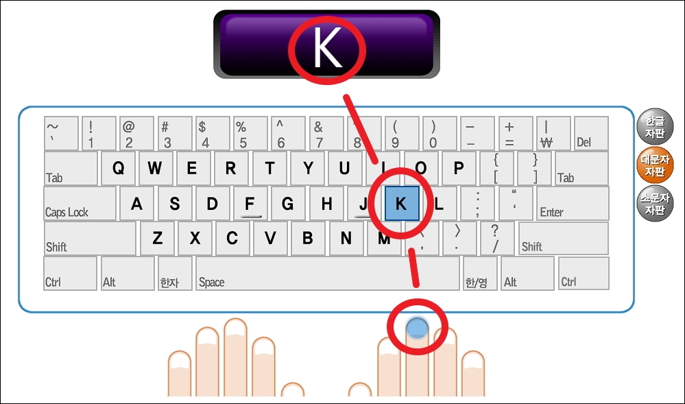 1. 기본적으로 어떤 프로그램을 사용하던지 위와 같은 화면과 같은 것이 좋습니다. 여러 가지 버튼에 대하여 해당 버튼을 어떤 손가락으로 눌러야 하는지 알려주기 때문인데요. 각 버튼에 맞는 손가락을 사용하는 습관을 제대로 들여야 합니다. 그렇지 않으면 나중에 제대로 된 방식으로 타이핑을 하기 위해 잘못된 습관을 고치려고 해도 쉽게 고쳐지지가 않기 때문입니다.