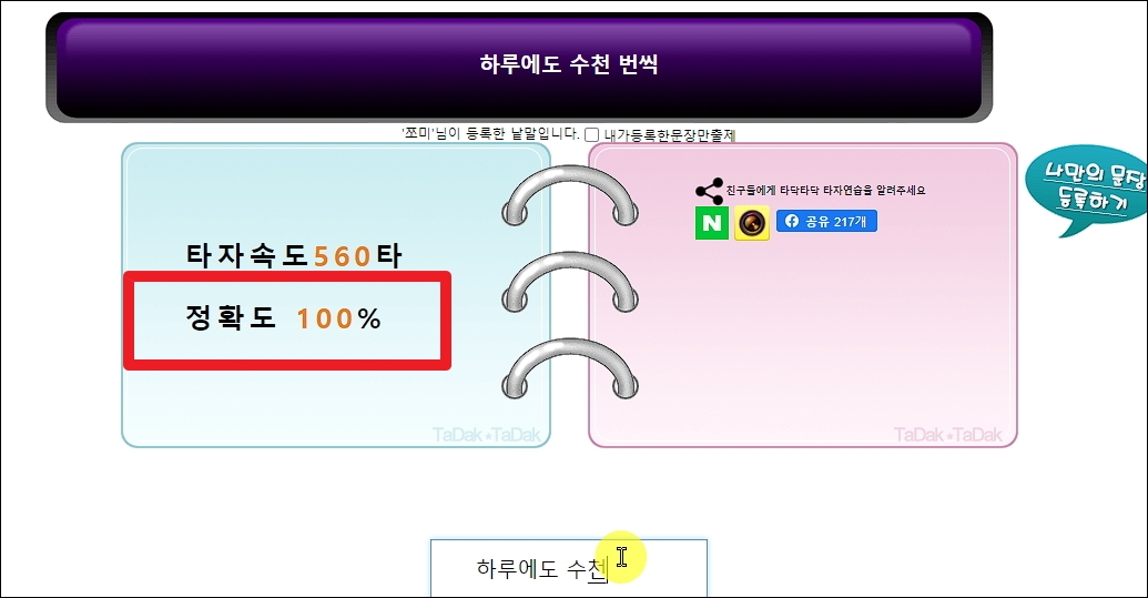7. 낱말 이후에는 문장을 가지고 컴퓨터 타자 연습을 진행합니다. 이 경우에도 정확도는 무조건 100%를 유지해 주세요.