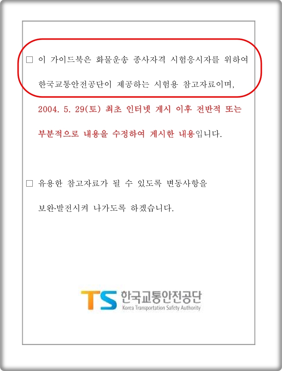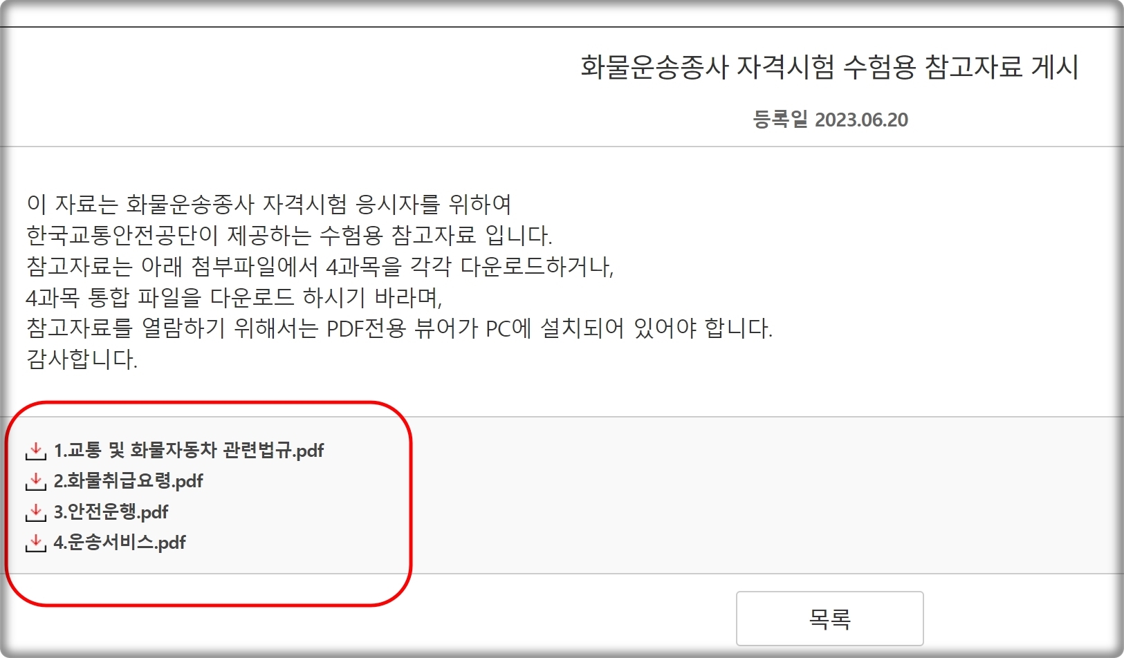 제가 앞서 언급해 드린 4가지 과목에 대하여 수업용 참고 자료를 첨부해 드리겠습니다. 최근에 한국 교통안전공단 사이트에서 올라온 자료이기 때문에 거의 최신 버전이에요. PDF 파일로 되어 있으니 PDF 뷰어를 사용하시면 돼요. 기출문제를 풀기 전에 한 번 정도는 읽어 보시는 것이 좋습니다.