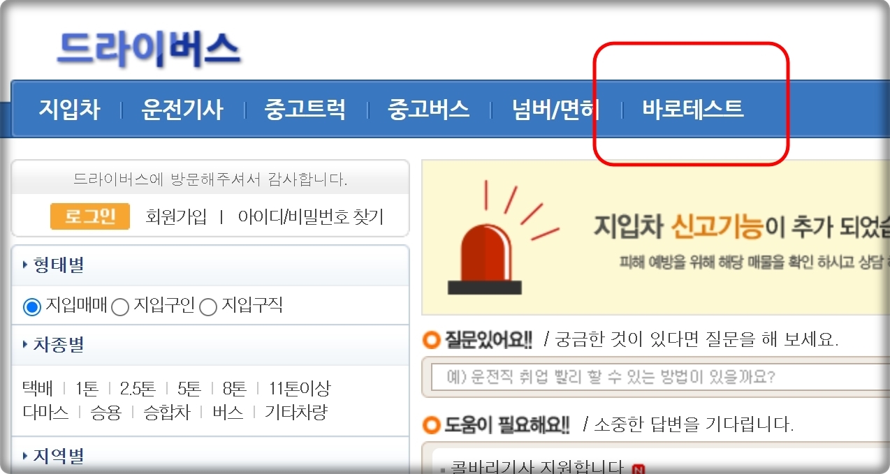 드라이버스 홈페이지에 접속했습니다. 여러 가지 메뉴가 보이는데요. 대부분은 실제로 일을 할 때 필요한 서비스이고, 맨 오른쪽에 있는 메뉴인 "바로테스트"만이 화물운송 자격시험 준비를 위한 서비스 입니다.