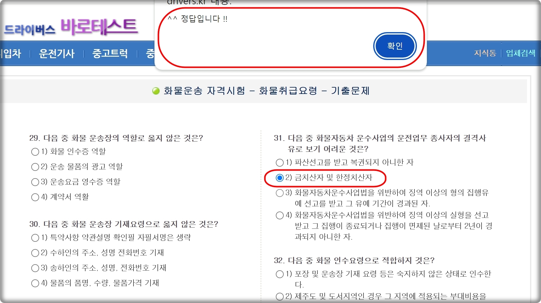 저는 두 번째 과목에 대한 기출문제를 선택했습니다. 운송장의 역할 및 기재요령, 화물 인수요령, 운전업무 종사자의 결격사유 등을 다루는 문제가 보이는데요. 각 문항을 잘 읽어 본 후, 답이라고 생각되는 선택지를 마우스로 클릭해 보세요. 그럼 바로 채점이 되어 정답 여부를 알 수 있습니다.