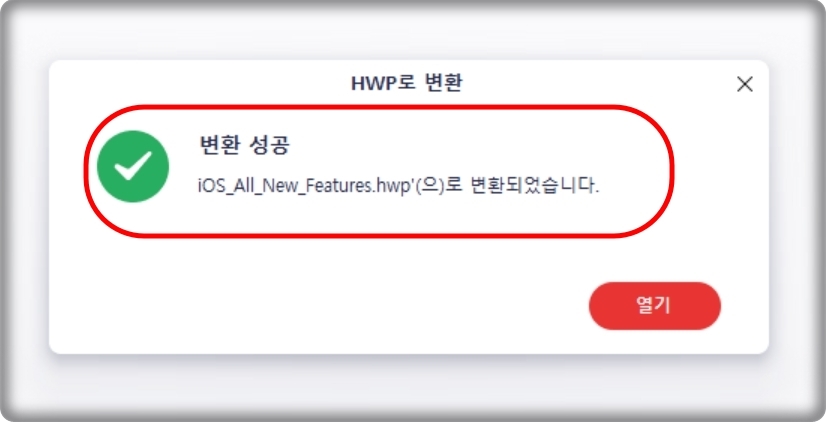 포맷을 지정한 다음에 저장 버튼을 누르니 hwp 한글 포맷으로 변환하는 창이 하나 열렸네요. 여기에서 100%로 표시가 되면 변환이 완료 되는데요. 생각보다 오래 걸리지 않습니다. 방금 테스트한 파일로는 5초 정도 걸린 것 같네요. 100%가 되면 성공 표시가 나타납니다.
