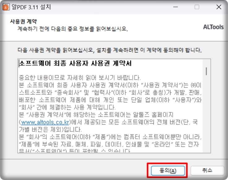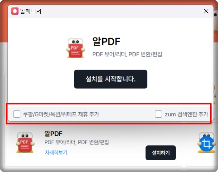 다운로드 받은 설치 파일을 실행하면 알PDF를 설치할 수 있어요. 설치가 진행되는 중간에 제휴라던가 검색 엔진을 추가하는 부분이 있는데요. 필요한 경우에 선택하시면 됩니다.