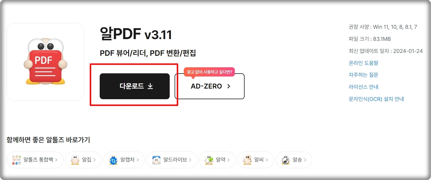 알PDF 프로그램을 다운로드 받을 수 있는 페이지가 열렸는데요. 옆에 있는 권장 사양을 보시면 윈도우 os에서 이용이 가능하다는 것을 알 수 있습니다. 올해 2024년에 업데이트가 될 정도로 주기적으로 관리가 되는 프로그램이에요. 그만큼 믿고 사용할 수 있다는 거죠. 용량도 83메가 정도밖에 되지 않기 때문에 컴퓨터에 전혀 부담이 없습니다.