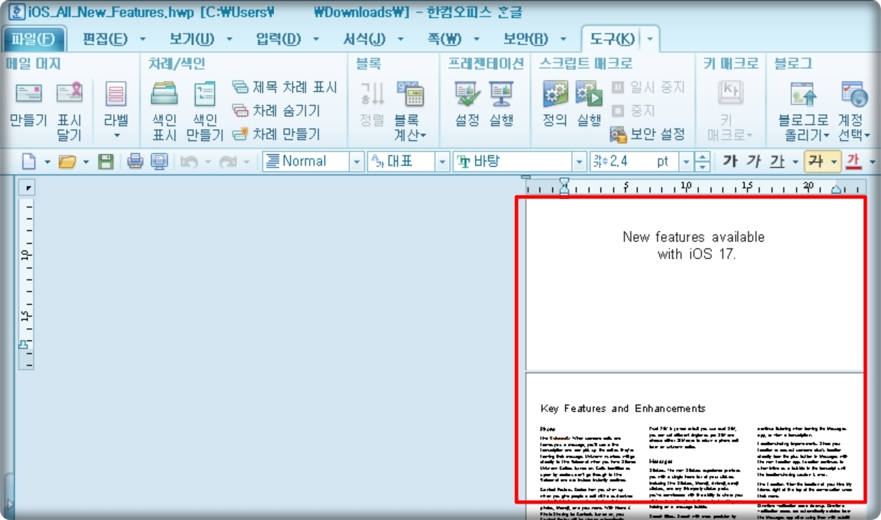 이제 아래아 한글 프로그램을 통하여 PDF에서 한글(hwp) 포맷으로 변환이 된 파일을 열어 보았습니다. 생각보다 깔끔하게 바뀐 것을 확인할 수 있었어요.