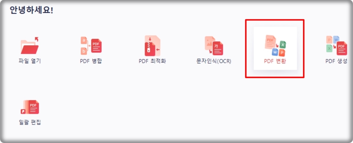 설치가 완료된 이후에 프로그램을 실행해 보았습니다. 우리가 진행할 한글파일로변환 작업을 하려면 화면에 있는 "PDF 변환" 메뉴를 클릭하면 됩니다.