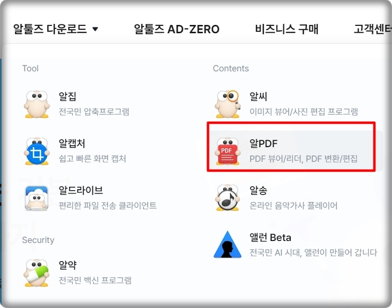 해당 프로그램을 설치하는 방법부터 알려 드리겠습니다. 가장 먼저 알툴즈 사이트에 접속해야 하는데요. 해당 사이트에 접속하면 여러 가지 관련 프로그램이 나타납니다 여기에서 알PDF를 선택해 주세요. 보시면 아시겠지만 여러 가지 컴퓨터를 사용하는데 유용한 프로그램이 많이 있습니다.