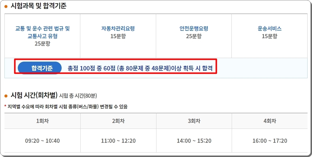 기출문제 자료를 이용하기에 버스운전 자격시험에 관련된 앞서 꼭 알아야 하는 사항을 몇 가지 알려 드리도록 하겠습니다. 우선 해당 시험에 경우에는 4개의 과목으로 이루어져 있습니다. 각자 출제되는 문항의 수는 25개 / 15개 / 25개 / 15개 인데요. 여기에서 48개 이상의 문제를 맞추었을 때 합격할 수 있습니다. 총 시험시간은 80분으로 1분에 한 문제씩은 풀어야 하는데요. 그만큼 시간이 넉넉지 않으니 참고하시길 바랍니다.