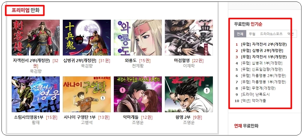 프리미엄 만화 카테고리를 살펴보면 묵검향 작가 외에도 이재학, 천제황, 활제, 고행석, 조명운 등의 작가의 만화를 무료로 볼 수 있네요. 우측에 있는 인기 순위를 참고하여 요즘 인기 있는 작품을 살펴보세요.