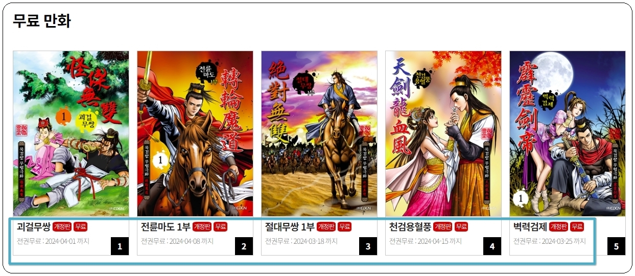 최근 서비스가 진행 중인 무료 만화 시리즈로는 괴걸무쌍, 전륜마도, 절대무쌍, 천검용혈풍, 벽력검제 이렇게 5가지 작품이 있네요.