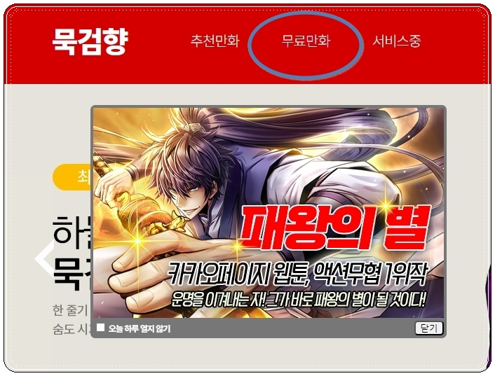첫 번째로 알려드릴 곳은 바로 묵검향 홈페이지 입니다. 인터넷 주소 이름을 보면 직관적으로 되어 있죠. 이곳에 접속하면 메뉴에서 "무료 만화"를 찾을 수 있을 겁니다.