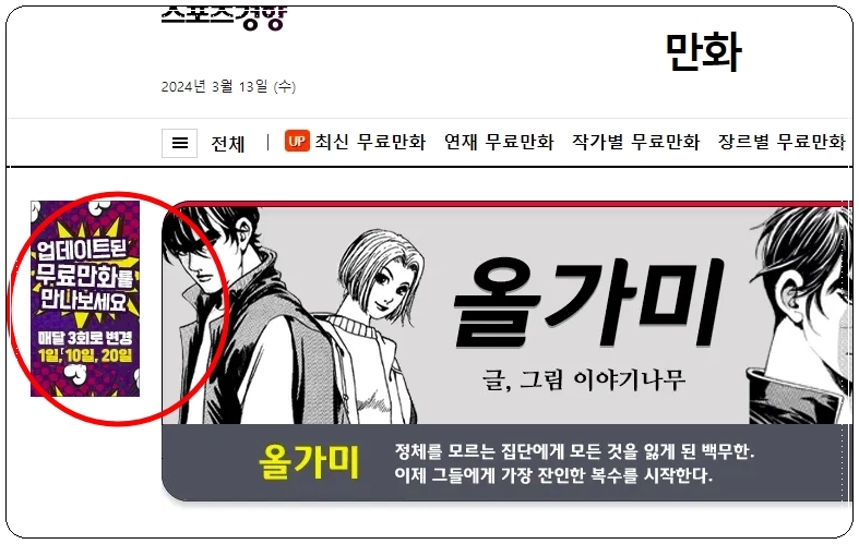 두 번째로 묵검향 작가의 작품을 무료로 볼 수 있는 곳은 스포츠경향 신문 사이트입니다. 이곳의 경우 매달 1일, 10일, 20일에 업데이트가 지속될 정도로 만화 서비스가 꽤 활성화가 되어 있는데요.