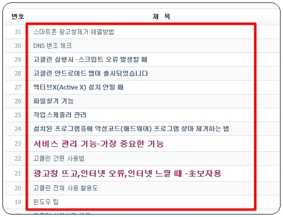 프로그램을 설치하면서 좌측에 있는 고클린 설명서와 자주하는 질문 게시판을 한 번 씩 둘러보는 것이 좋습니다. 이곳에서 고클린을 사용할 때 도움이 되는 팁과 설명이 꽤 많이 있기 때문이에요. 컴퓨터에 대한 최적화를 제대로 하고 싶은 분은 이 부분을 꼭 숙지하시길 바랍니다.