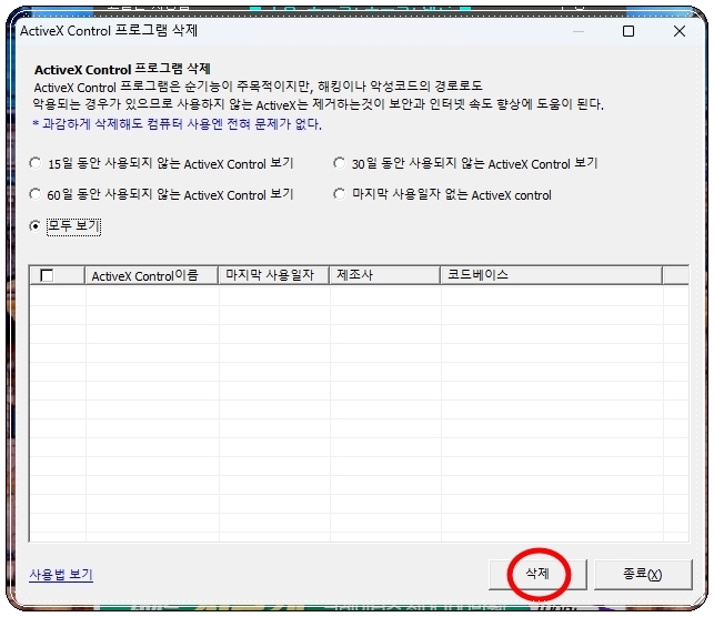 두 번째는 엑티브 X 프로그램 삭제 기능인데요. 이 기능은 더욱 더 사용하기 쉽습니다. 화면에 나타난 모든 엑티브X를 지워도 돼요. 자주 이용하는 것이 있다면 빼고 지워도 되는데요. 조금 번거롭기 때문에 일괄 삭제한 후 필요한 것만 다시 설치해서 사용하는 것이 편리합니다.