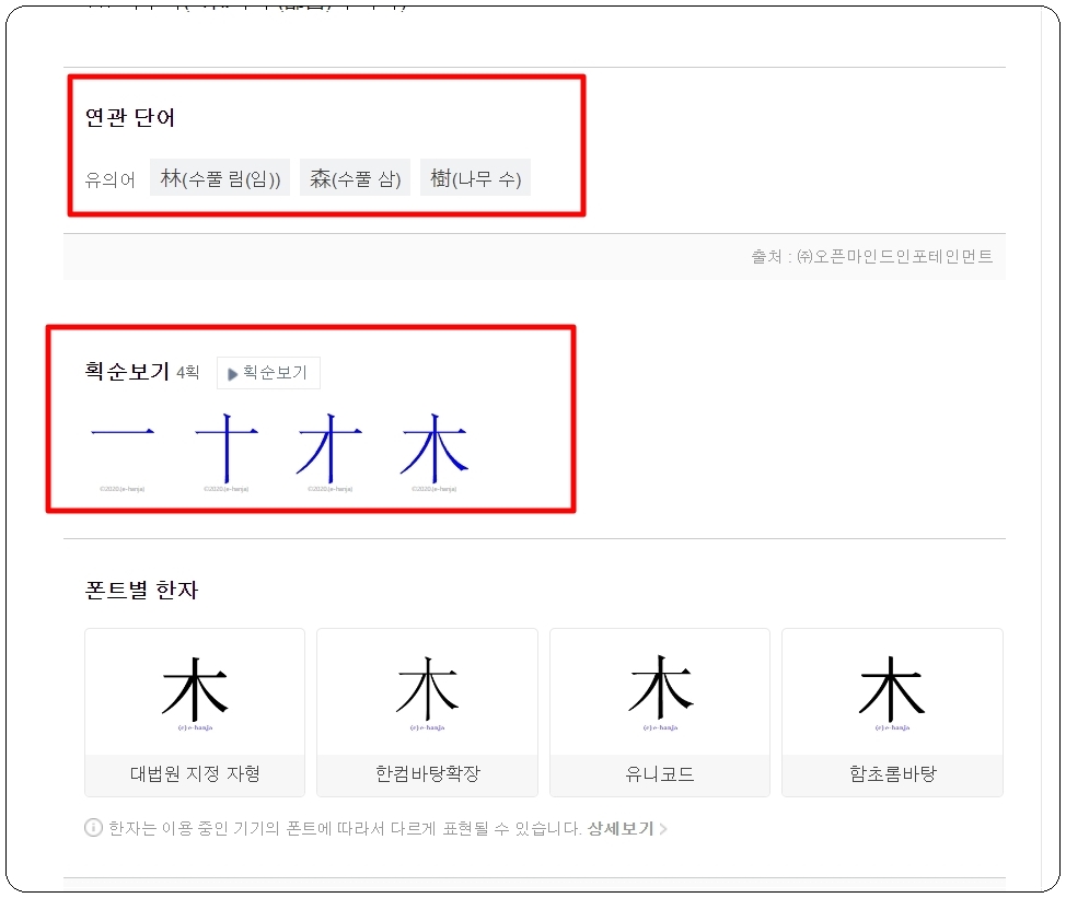 저는 "나무 목"이라는 한문을 선택했는데요. 꽤 많은 뜻을 만나볼 수 있었습니다. 여기에 더하여 부수, 모양자, 총획수, 유니코드, 난이도 등 한자 검색기를 통해 깊이 있는 사전 정보를 만나볼 수 있습니다. 연관 단어나 획순보기의 경우에는 한문 공부를 할 때 꽤 도움이 되죠.