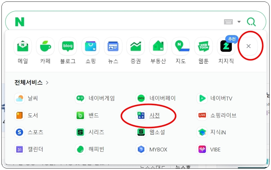 인터넷을 자주 하는 분이라면 네이버 사이트에 접속할 일이 자주 있을 겁니다. 검색창 옆에 있는 전체 메뉴 보기 버튼을 클릭해 보세요. 그럼 [사전] 메뉴를 찾을 수 있습니다.