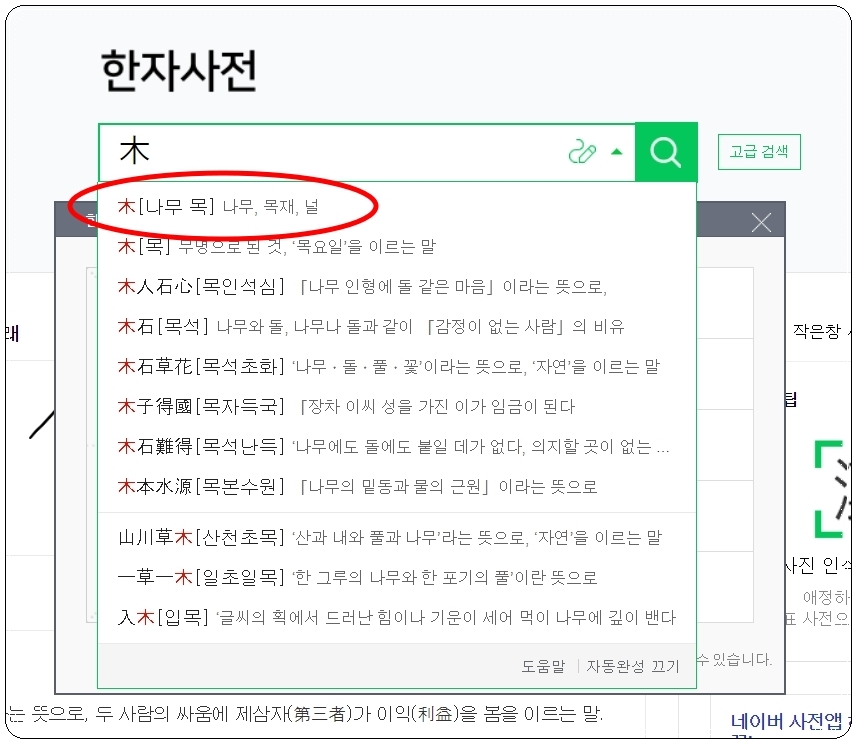 제가 직접 한문 필기인식기를 사용해 보도록 하겠습니다. 제대로 그리지 않았음에도 불구하고, 필기인식기가 제가 찾길 원하는 한자를 알려주네요. 우리가 그린 그림 옆에 있는 목록에서 자신이 검색기를 통해 알아보고자 한 한자를 선택해주세요. 그럼 검색기 안에 입력이 되는데요. 이 상태에서 자동완성으로 여러 가지 관련 목록이 나타납니다. 알아보고 싶은 것을 선택해 주세요.