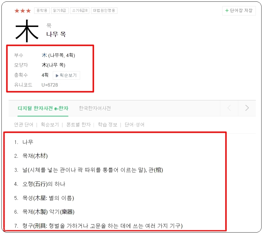 좀 더 한자를 제대로 배우고 싶은 분들은 학습정보에 있는 한문의 구성원리 부분을 살펴보아주세요. "나무 목"이 나무의 모양을 표현한 것이라고 하네요. 이러한 내용을 알고 있으면 좀 더 기억하기 쉽습니다. 그 밖에 상형문자, 사성음, 영문 표기, 관련 단어 및 고사성어 등 많은 사전 정보를 얻을 수 있어요.