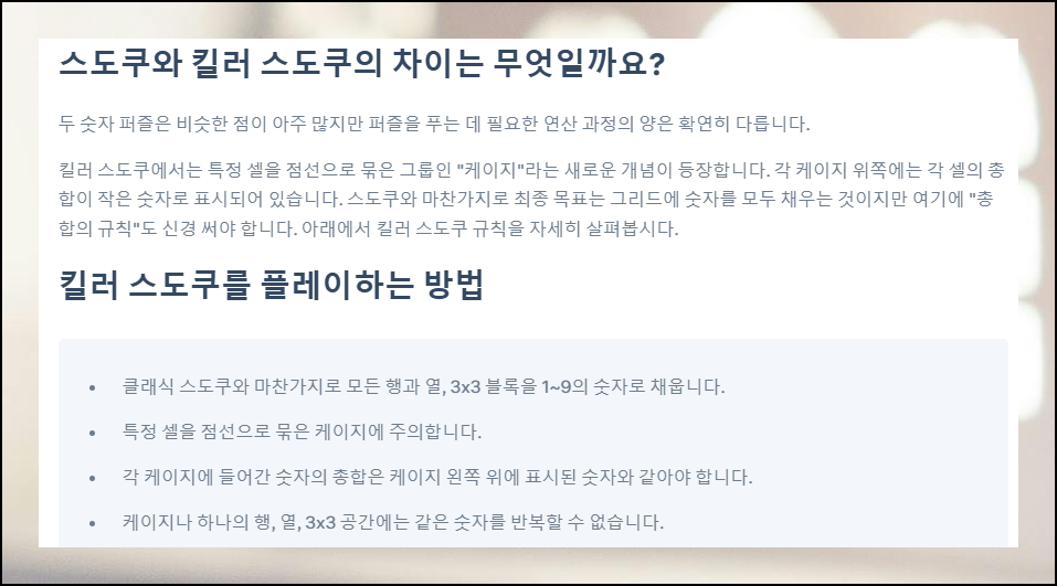일반 버전과 킬러 버전 모두 무료로 활용할 수 있어요. 킬러 모드는 일반 스도쿠에 "케이지"라는 요소가 추가된 형태입니다. 케이지 좌측 상단에 표시된 숫자는 그 안에 들어갈 모든 숫자의 합을 의미해요. 기본 규칙을 지키면서 이 합계 조건도 맞아야 하는 흥미로운 변형 게임입니다.